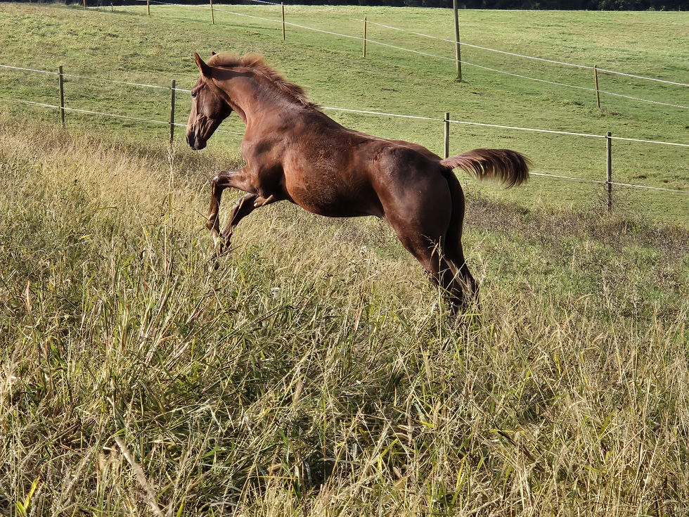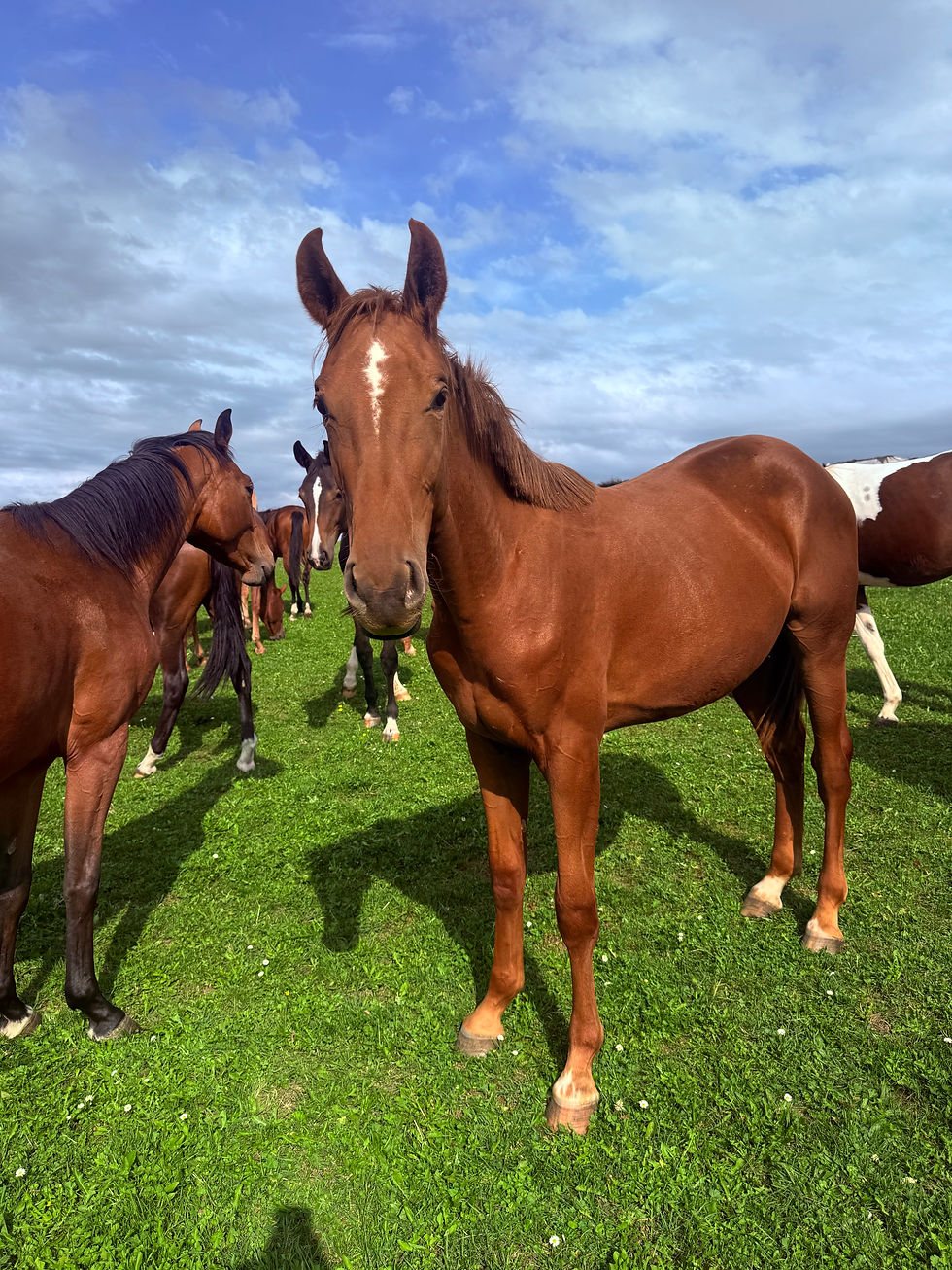 Gladys ist das drittgeborene Fohlen von Samira. Wir lieben ihre Fuchsfarbe, die wir so gar nicht erwartet haben mit Mama braun und Papa schwarz. Sie ist im Gegensatz zu den ersten beiden viel entspannter im Umgang und scheint einen unkomplizierten Charakter zu haben. Sie hat einen starken Körperbau und die süssgeformten Ohren von Mami Samira durfte sie ebenfalls erben. Im 2026 kommt sie dann unter den Sattel, wir sind gespannt.